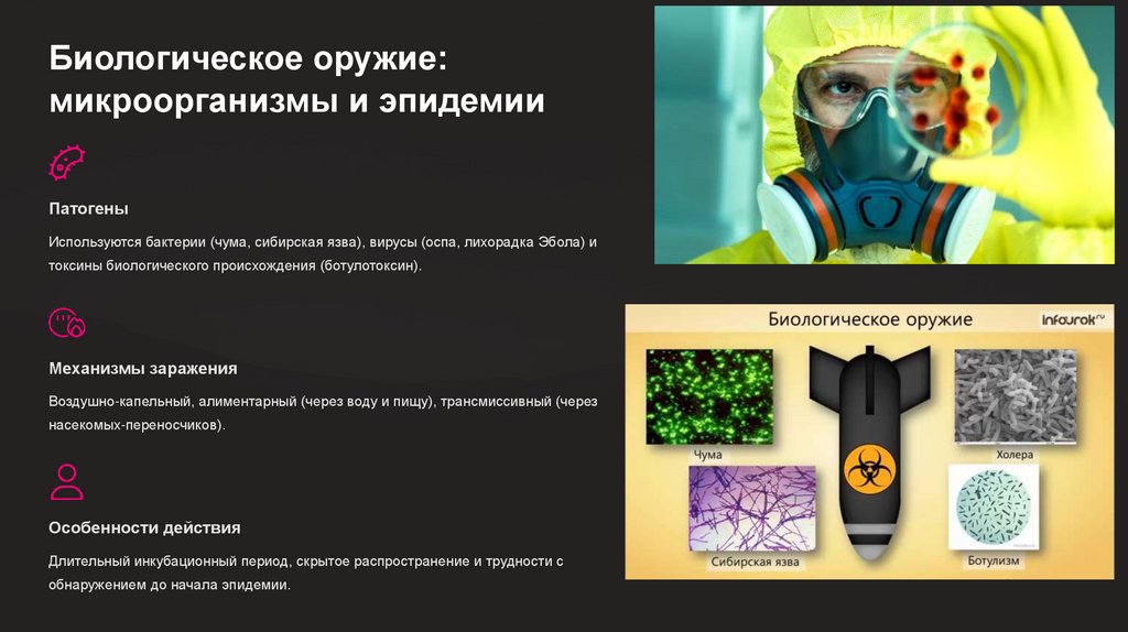 Используются бактерии (чума, сибирская язва), вирусы (оспа, лихорадка Эбола) и