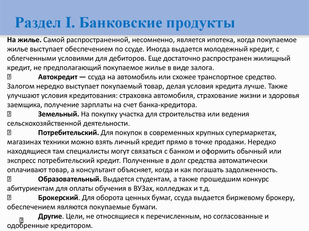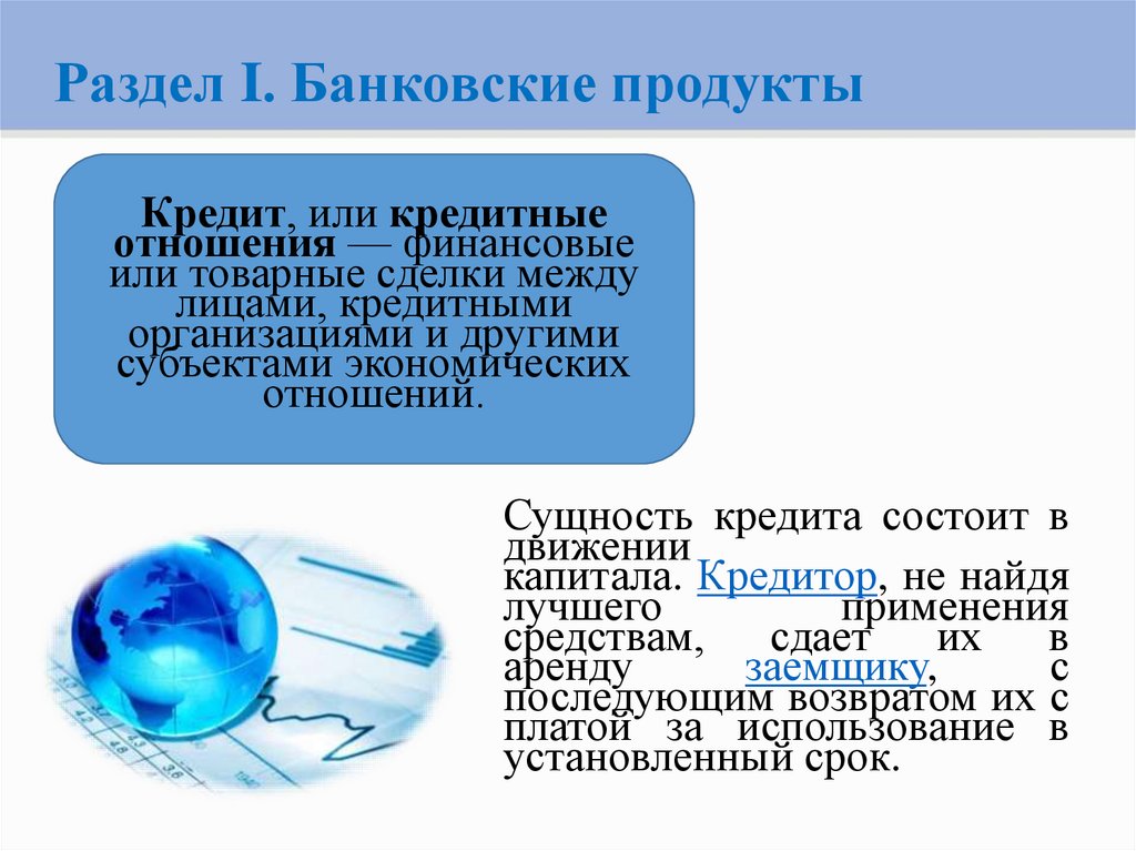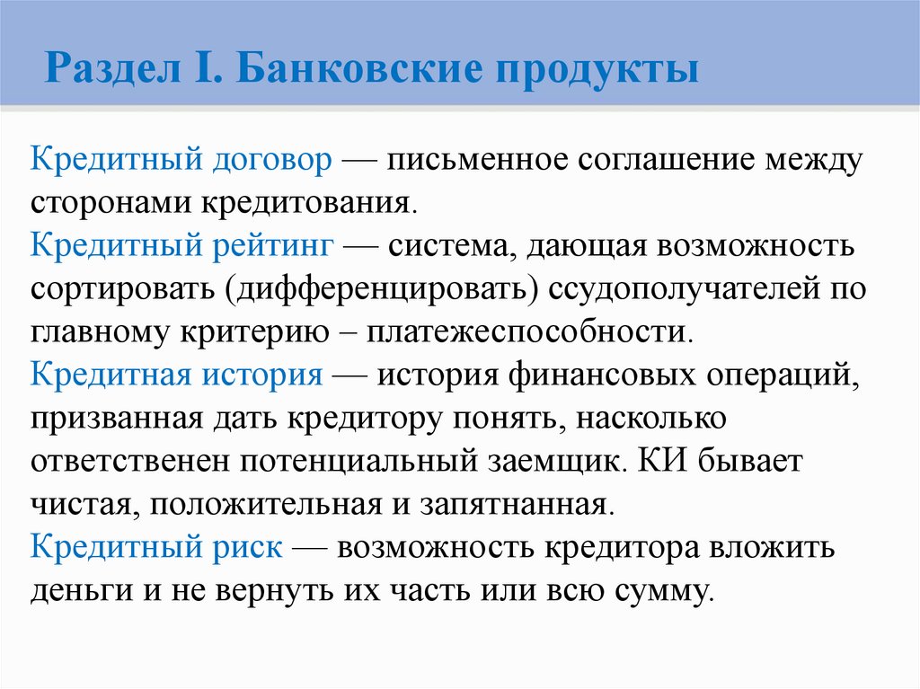 Раздел I. Банковские продуктыКредитный договор — письменное соглашение между