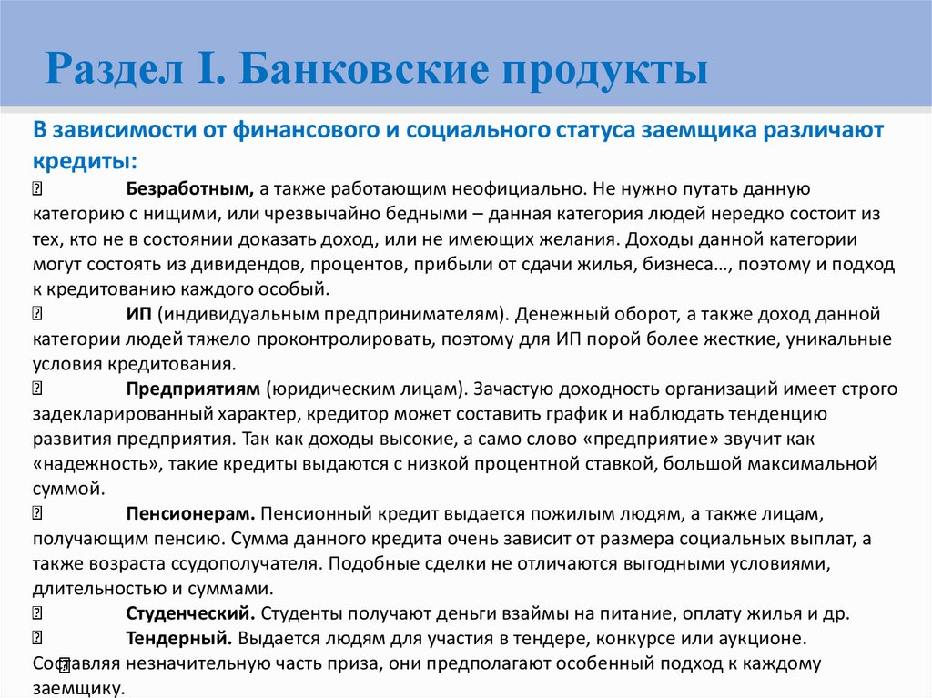 Раздел I. Банковские продуктыВ зависимости от финансового и социального статуса заемщика различают