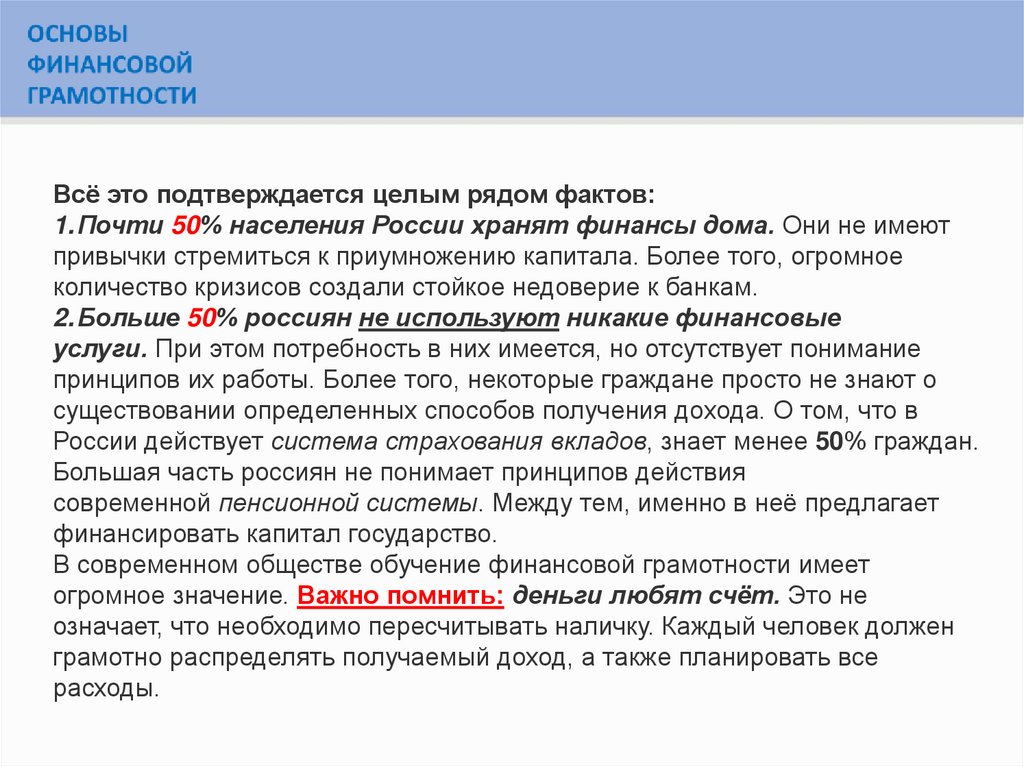 Всё это подтверждается целым рядом фактов:1. Почти 50% населения России хранят финансы дома. Они не имеют