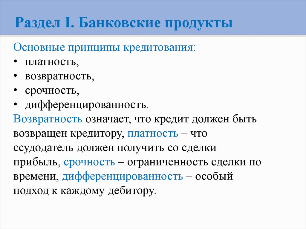 Раздел I. Банковские продуктыОсновные принципы кредитования:
