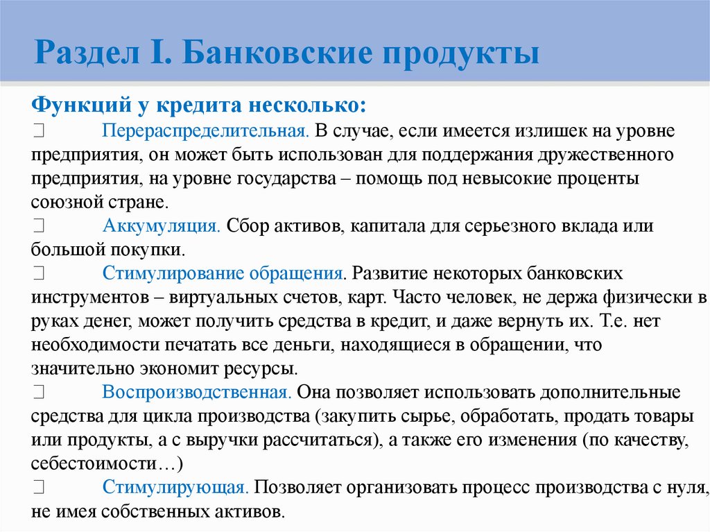 Раздел I. Банковские продуктыФункций у кредита несколько: