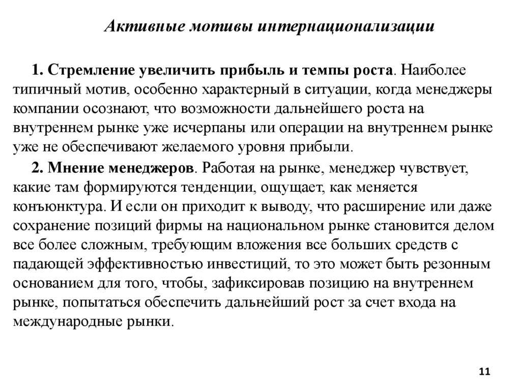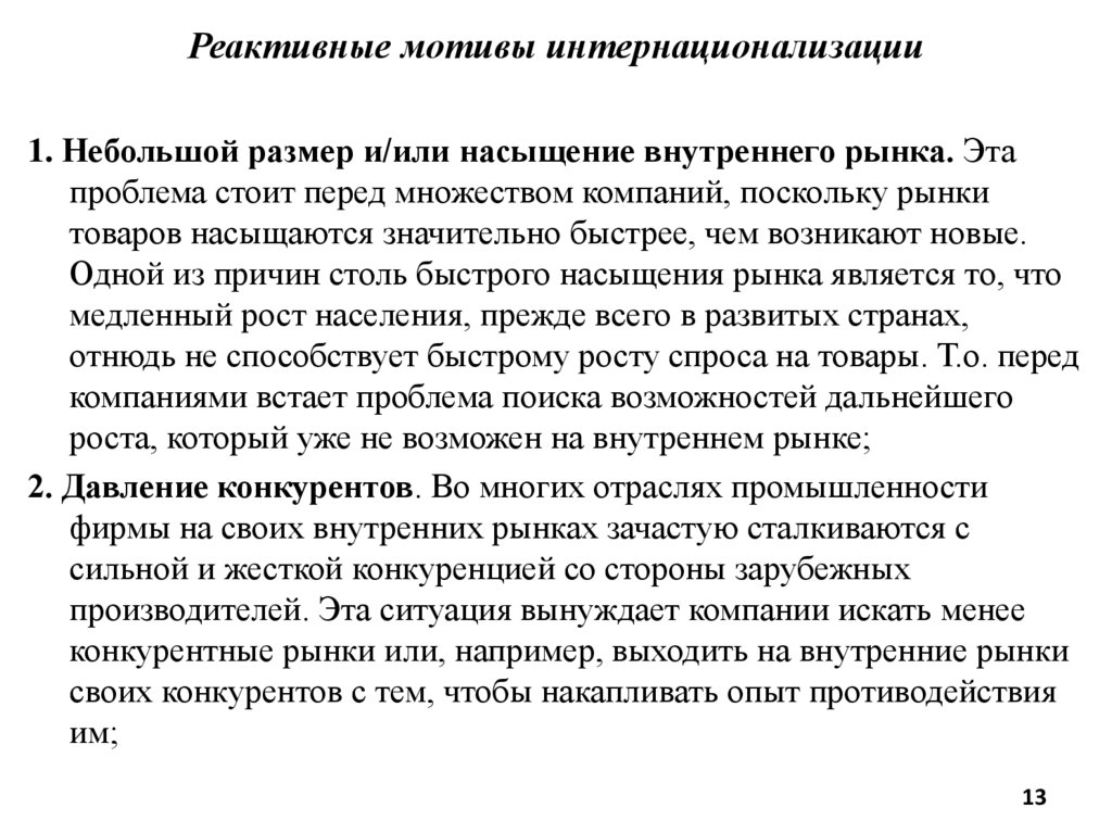 Реактивные мотивы интернационализации1. Небольшой размер и/или насыщение внутреннего рынка. Эта