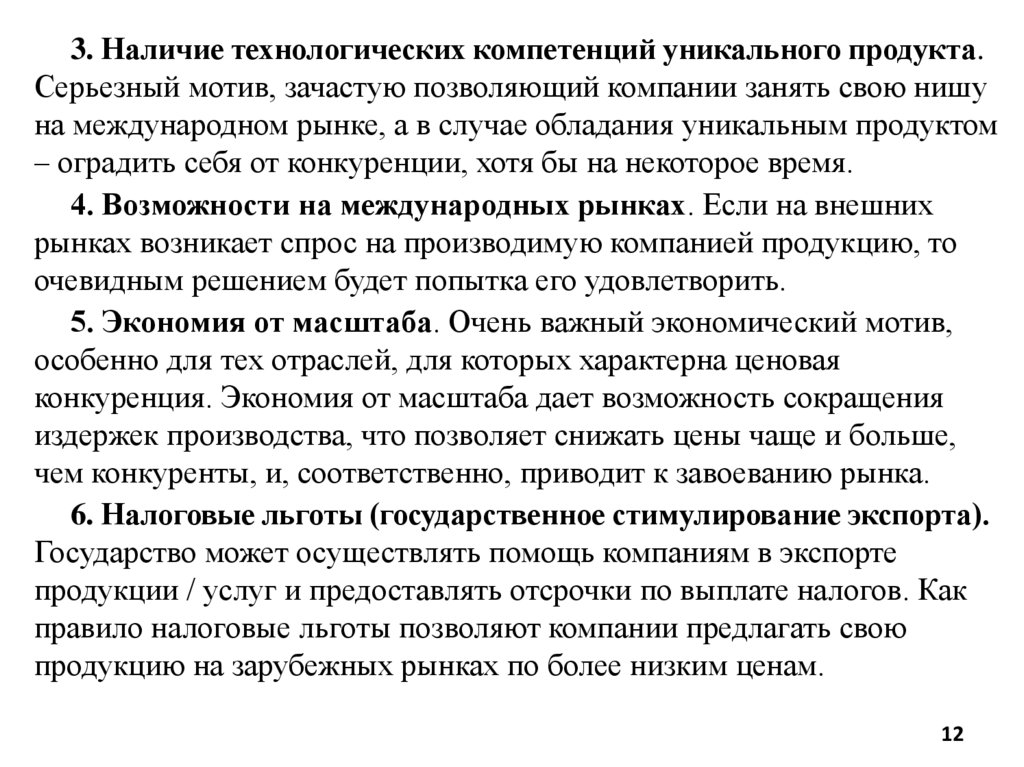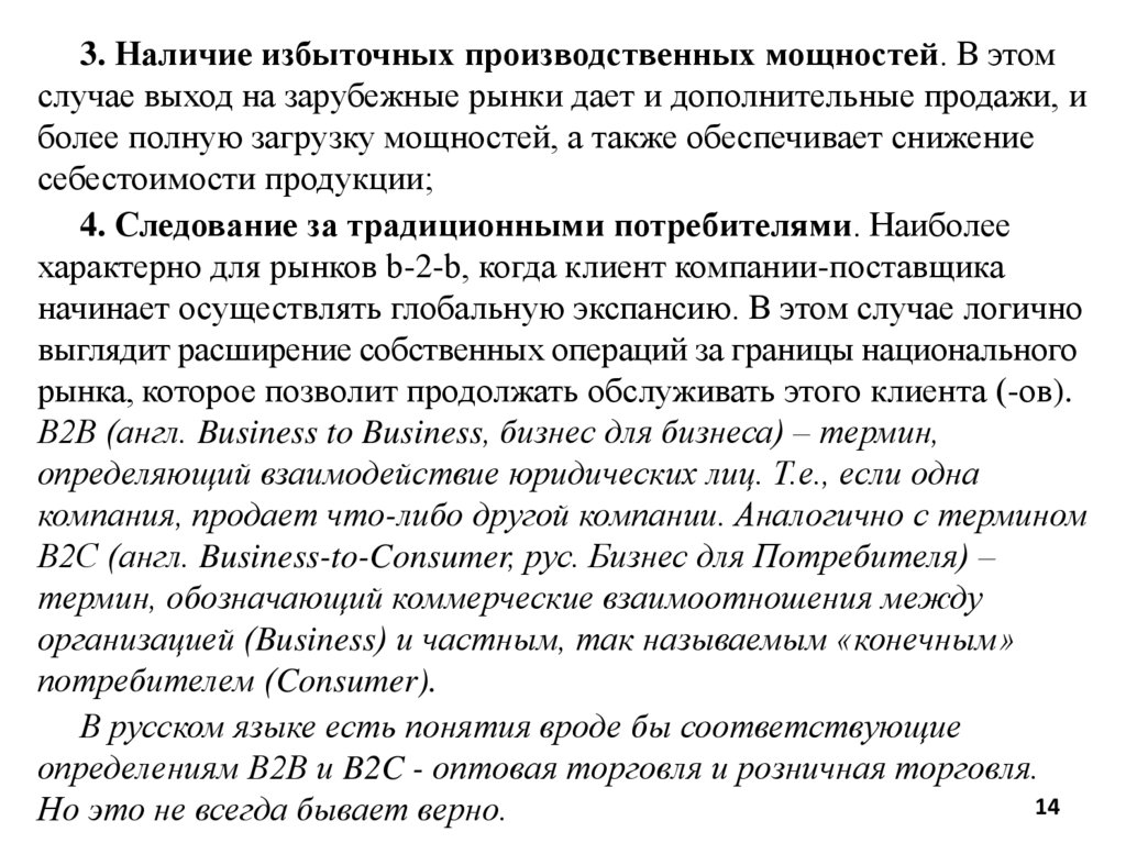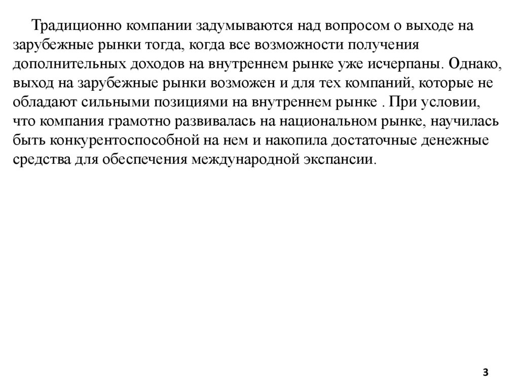 3. Наличие избыточных производственных мощностей. В этомслучае выход на зарубежные рынки дает и дополнительные продажи, и