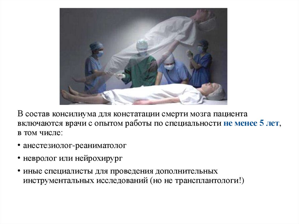 В состав консилиума для констатации смерти мозга пациентавключаются врачи с опытом работы по специальности не менее 5 лет,