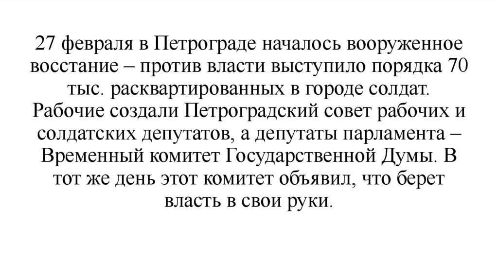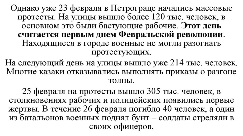 Однако уже 23 февраля в Петрограде начались массовыепротесты. На улицы вышло более 120 тыс. человек, в