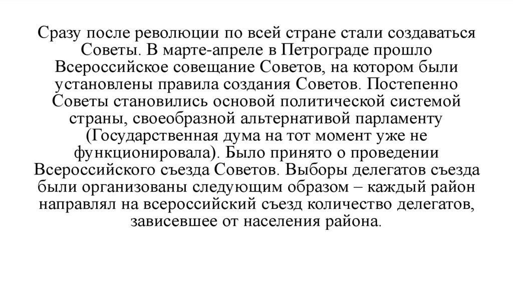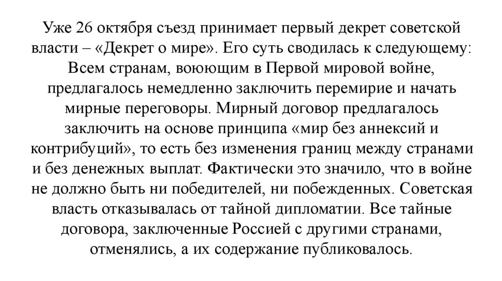 Уже 26 октября съезд принимает первый декрет советскойвласти – «Декрет о мире». Его суть сводилась к следующему: