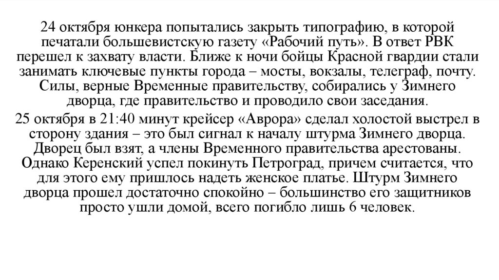 перешел к захвату власти. Ближе к ночи бойцы Красной гвардии стали
