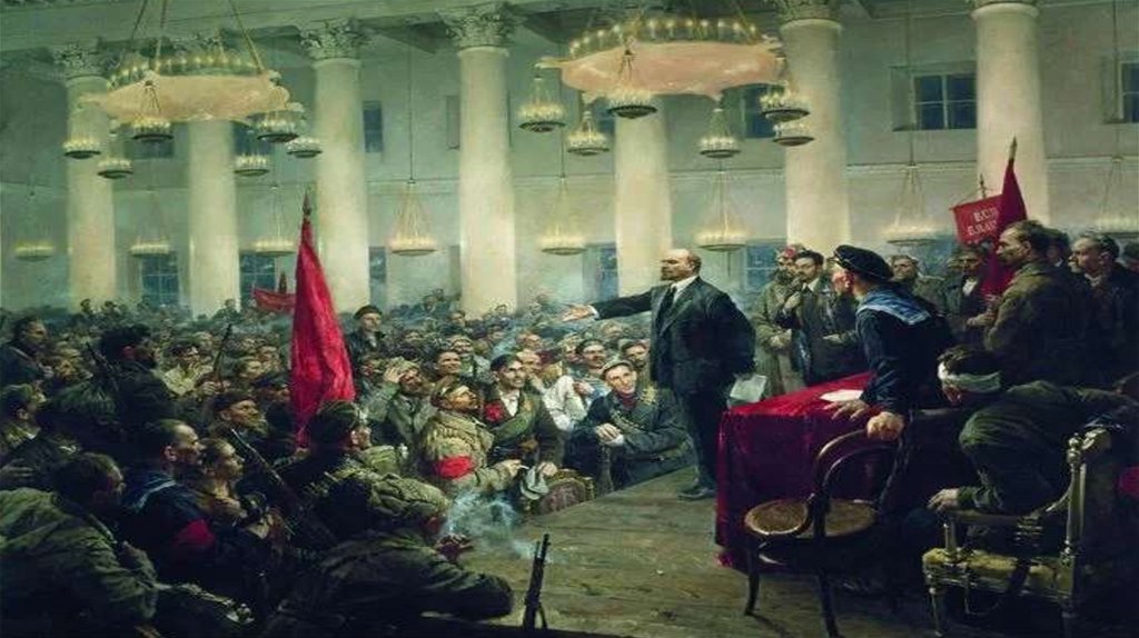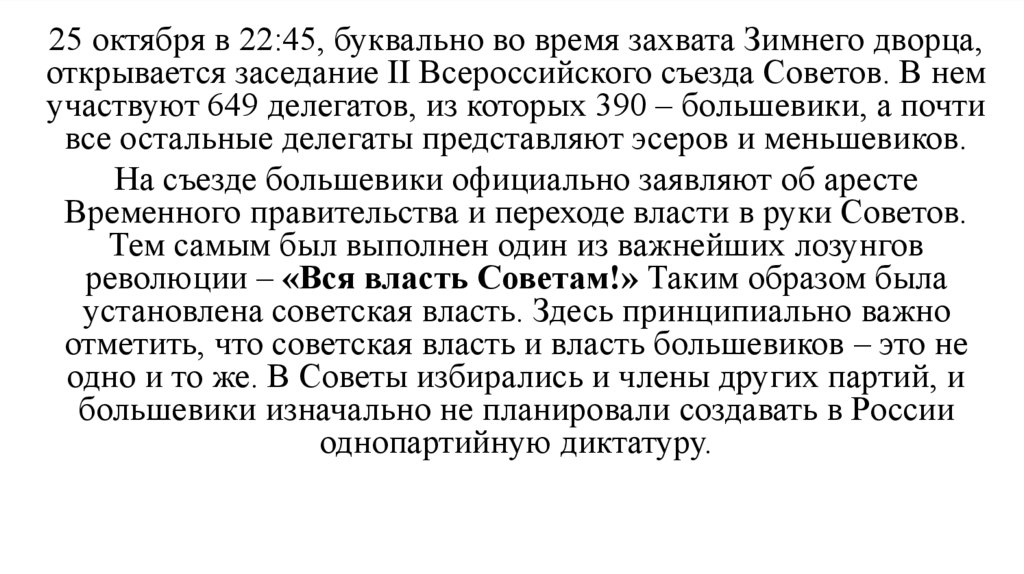 25 октября в 22:45, буквально во время захвата Зимнего дворца,открывается заседание II Всероссийского съезда Советов. В нем