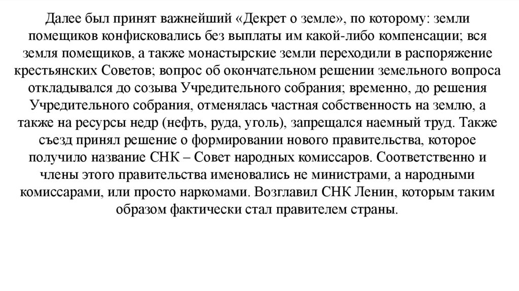 Далее был принят важнейший «Декрет о земле», по которому: землипомещиков конфисковались без выплаты им какой-либо компенсации; вся