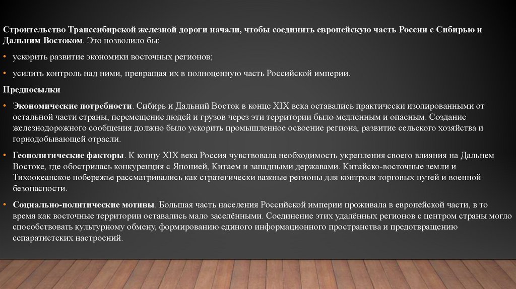 • Экономические потребности. Сибирь и Дальний Восток в конце XIX века оставались практически изолированными от