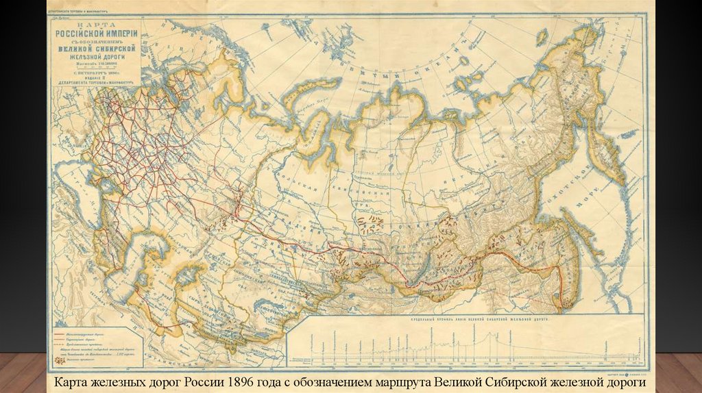 • Тут должна быть картаКарта железных дорог России 1896 года с обозначением маршрута Великой Сибирской железной дороги