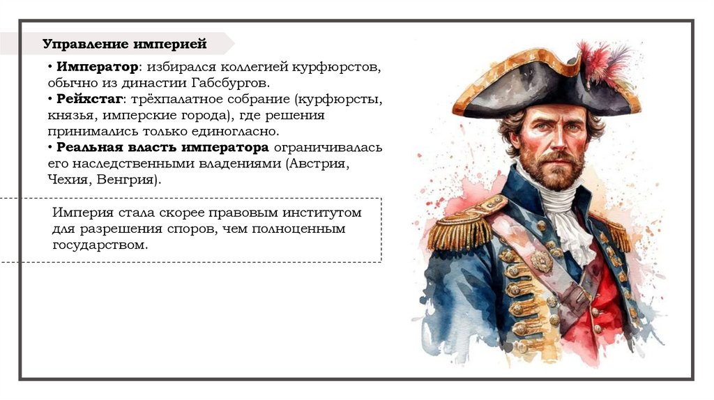 Управление империей• Император: избирался коллегией курфюрстов,