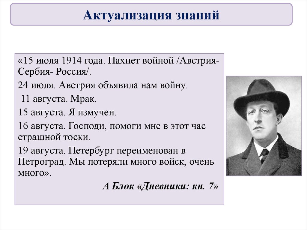 Актуализация знаний«15 июля 1914 года. Пахнет войной /АвстрияСербия- Россия/.