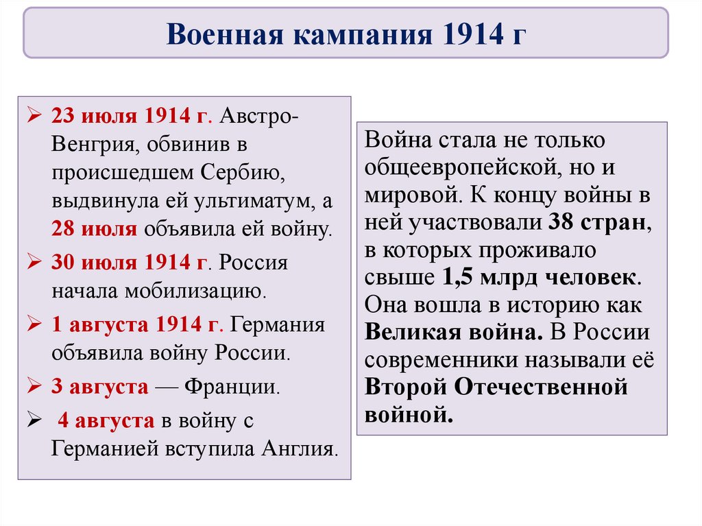 Военная кампания 1914 г23 июля 1914 г. АвстроВенгрия, обвинив в