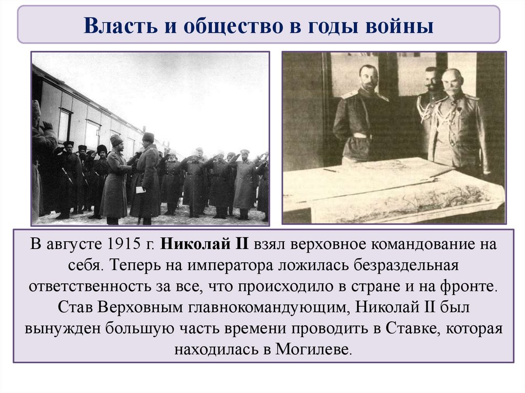 Власть и общество в годы войныВ августе 1915 г. Николай II взял верховное командование на