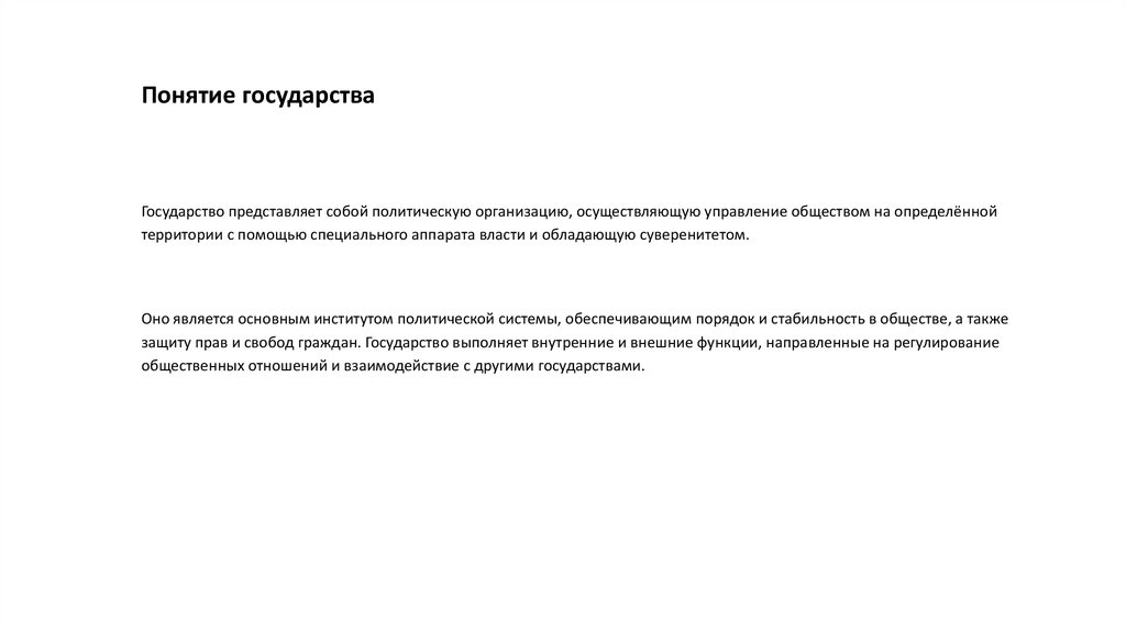 Понятие государстваГосударство представляет собой политическую организацию, осуществляющую управление обществом на определённой