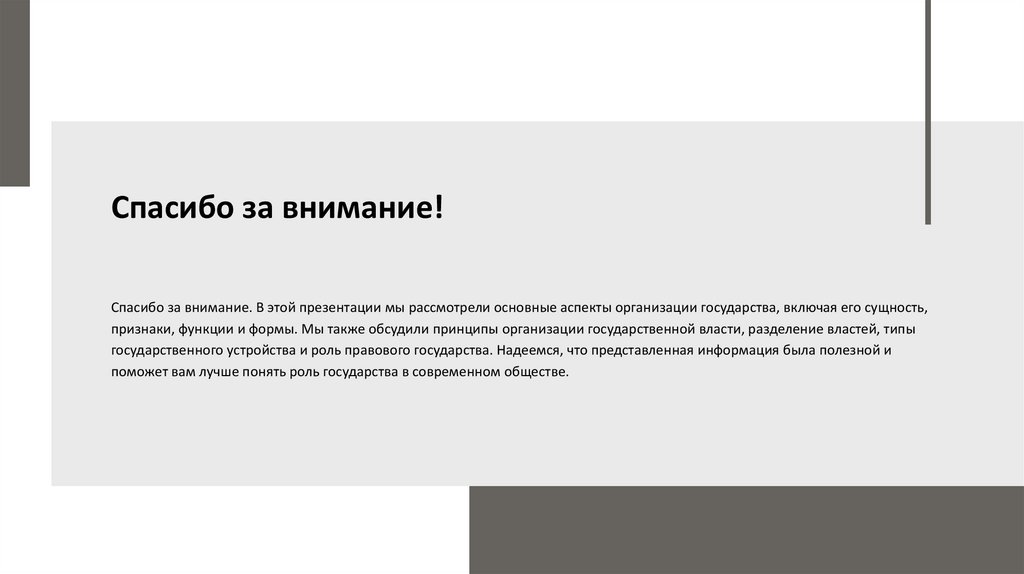 Спасибо за внимание!Спасибо за внимание. В этой презентации мы рассмотрели основные аспекты организации государства, включая его сущность,