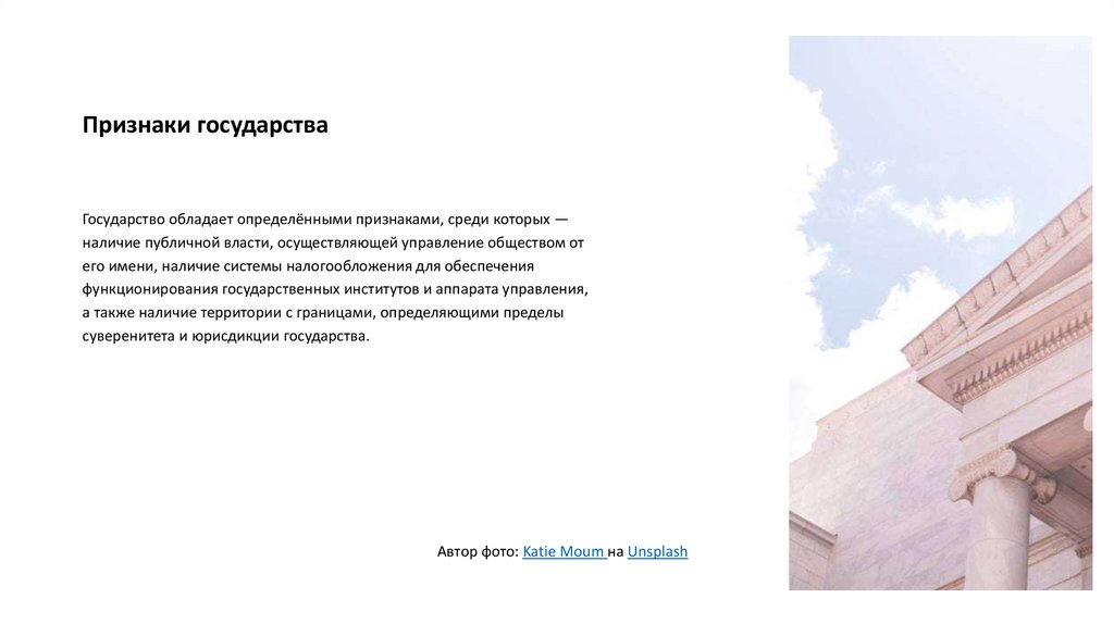 Признаки государстваГосударство обладает определёнными признаками, среди которых —