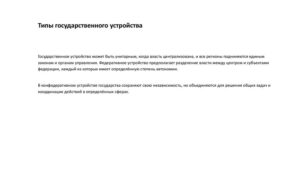 Типы государственного устройстваГосударственное устройство может быть унитарным, когда власть централизована, и все регионы подчиняются единым