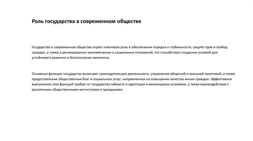 Роль государства в современном обществеГосударство в современном обществе играет ключевую роль в обеспечении порядка и стабильности, защите прав и свобод