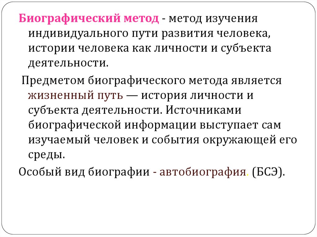 Биографический метод - метод изученияиндивидуального пути развития человека,