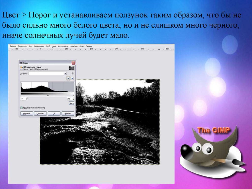 Цвет > Порог и устанавливаем ползунок таким образом, что бы небыло сильно много белого цвета, но и не слишком много черного,