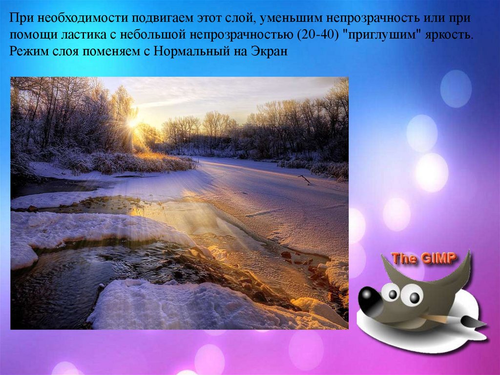При необходимости подвигаем этот слой, уменьшим непрозрачность или припомощи ластика с небольшой непрозрачностью (20-40) "приглушим" яркость.