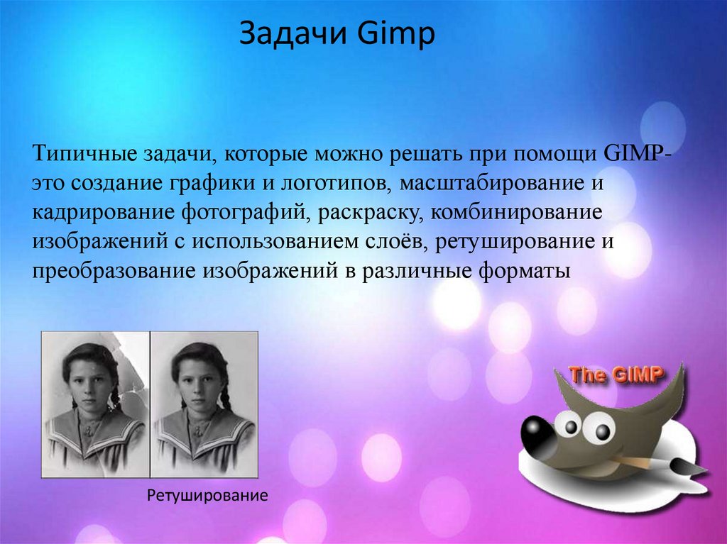 Задачи GimpТипичные задачи, которые можно решать при помощи GIMPэто создание графики и логотипов, масштабирование и