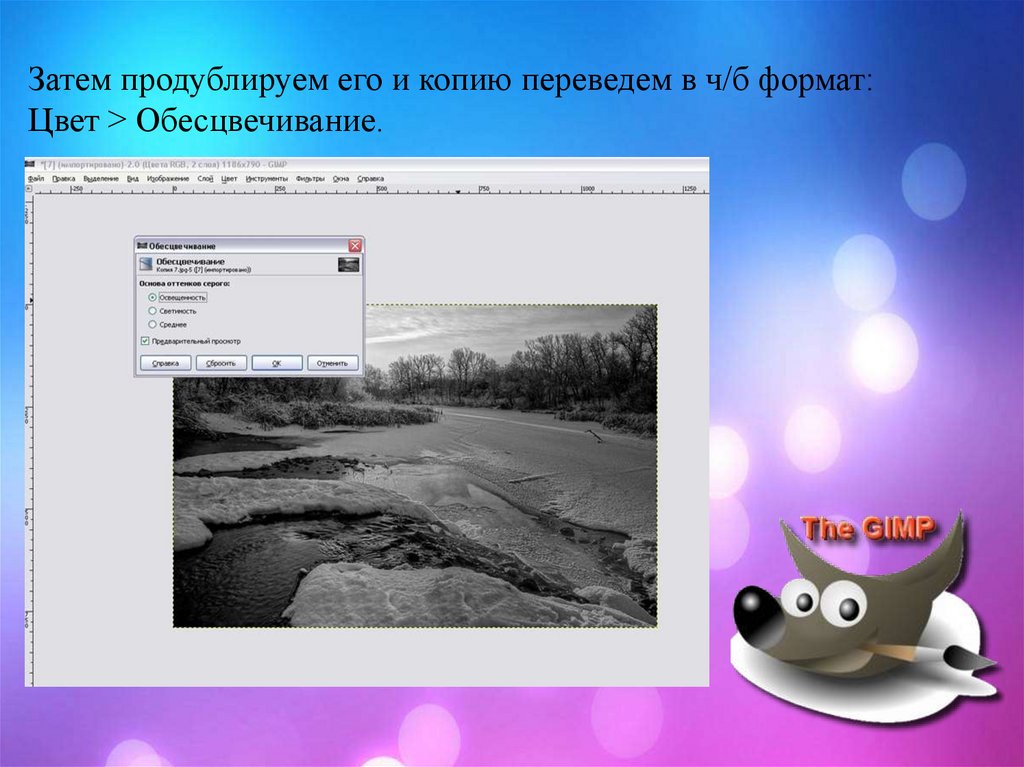 Затем продублируем его и копию переведем в ч/б формат:Цвет > Обесцвечивание.