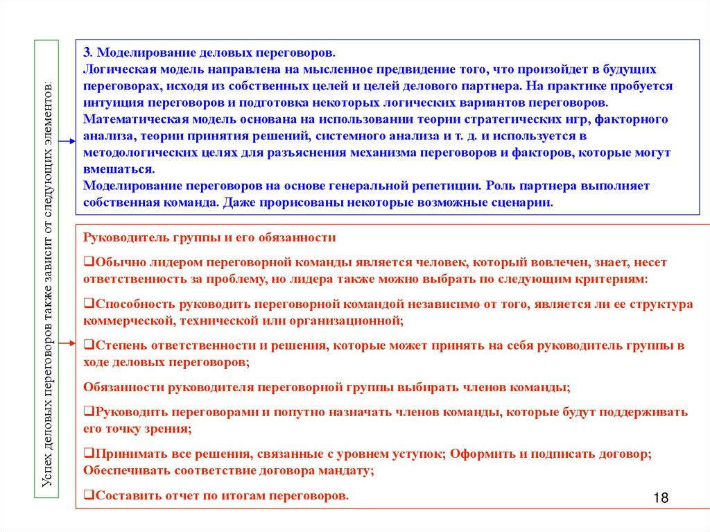 Успех деловых переговоров также зависит от следующих элементов:3. Моделирование деловых переговоров.