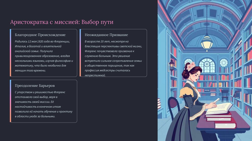 Флоренс заботилась не только о физическом, но и о психологическом состоянии пациентов, создавая читальни,