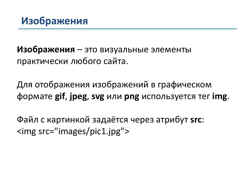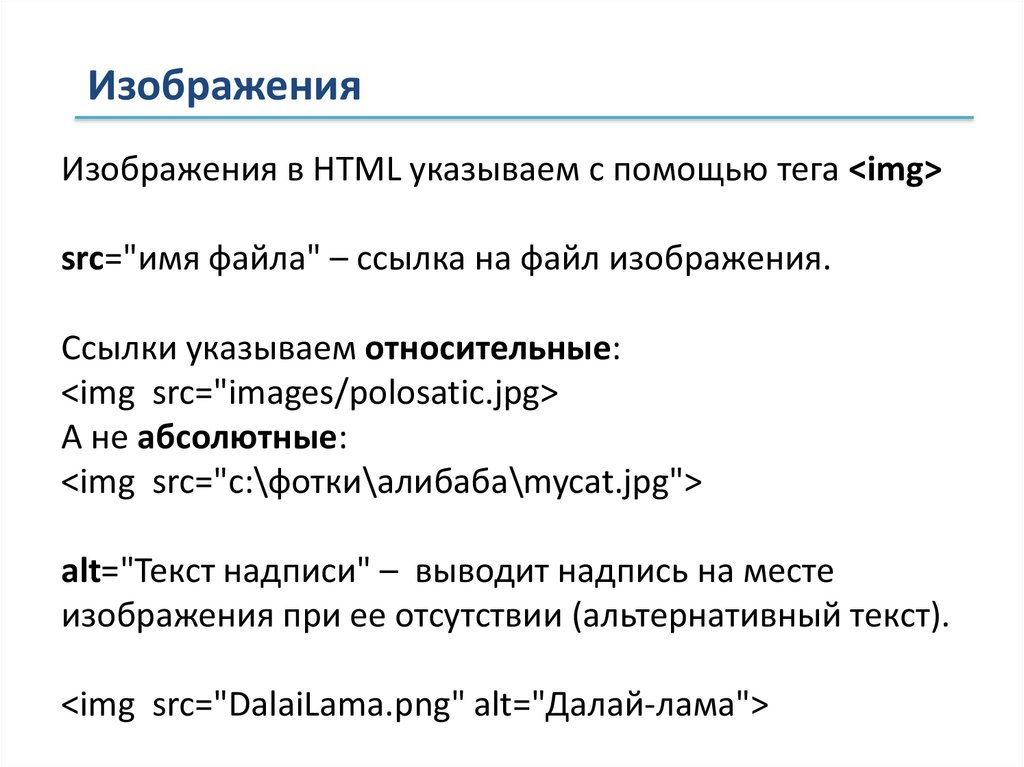ИзображенияИзображения в HTML указываем с помощью тега <img>