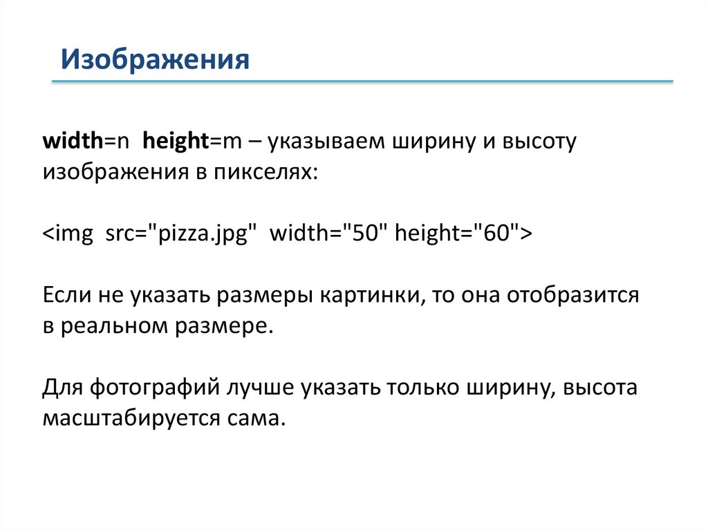 Изображенияwidth=n height=m – указываем ширину и высоту