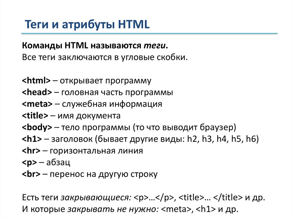 Теги и атрибуты HTMLКоманды HTML называются теги.