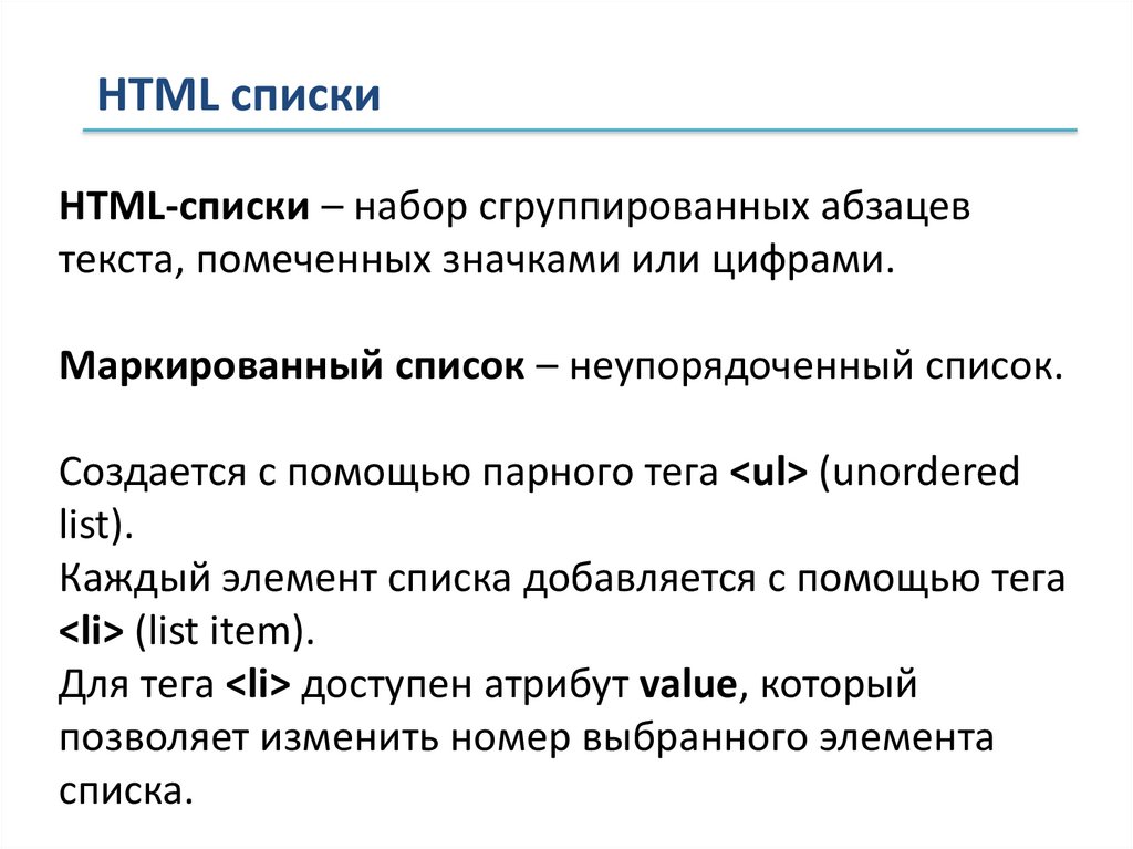 HTML спискиHTML-списки – набор сгруппированных абзацев