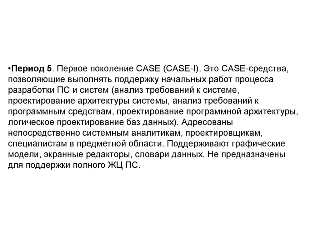 •Период 5. Первое поколение CASE (CASE-I). Это CASE-средства,позволяющие выполнять поддержку начальных работ процесса