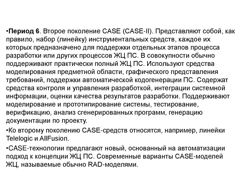 •Период 6. Второе поколение CASE (CASE-II). Представляют собой, какправило, набор (линейку) инструментальных средств, каждое их