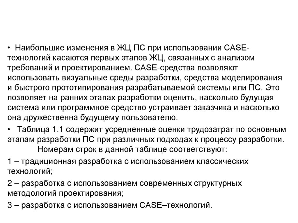• Наибольшие изменения в ЖЦ ПС при использовании CASEтехнологий касаются первых этапов ЖЦ, связанных с анализомтребований и проектированием. CASE-средства позволяют