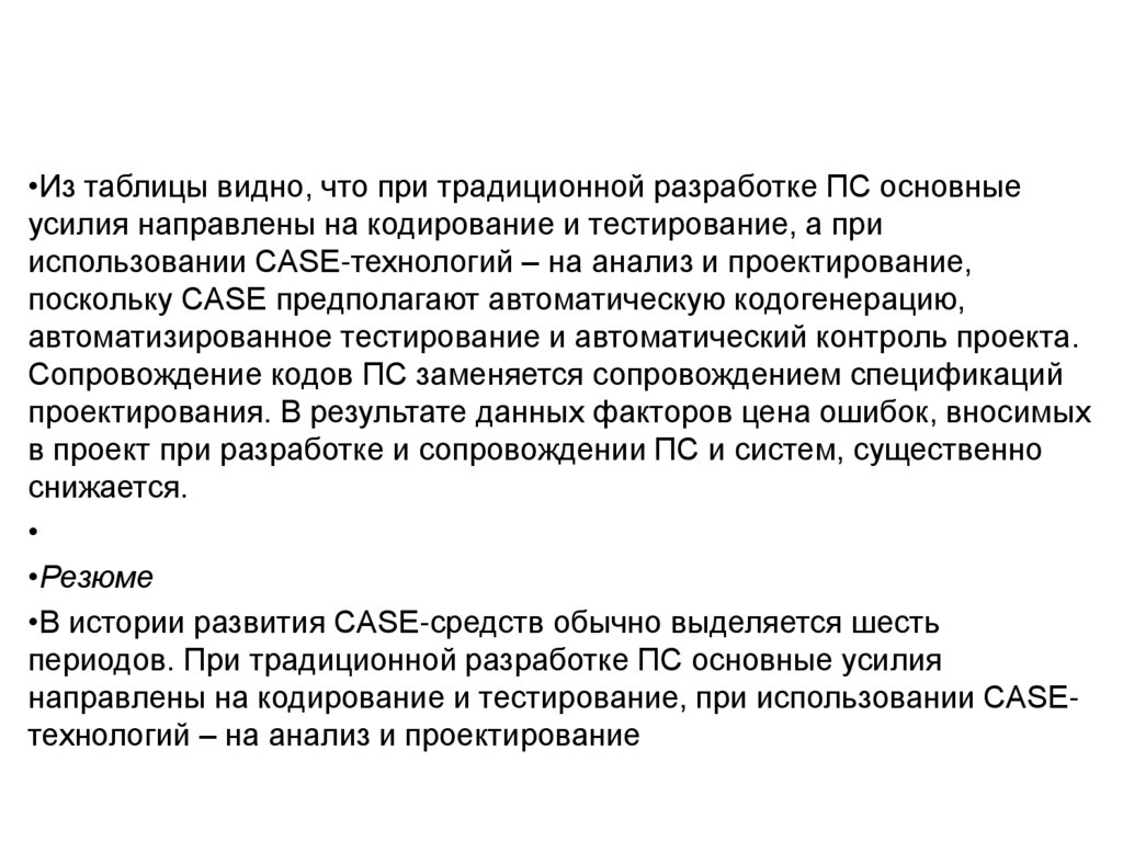 направлены на кодирование и тестирование, при использовании CASEтехнологий – на анализ и проектирование