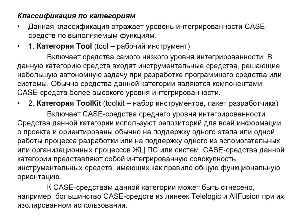 Классификация по категориям• Данная классификация отражает уровень интегрированности CASEсредств по выполняемым функциям.