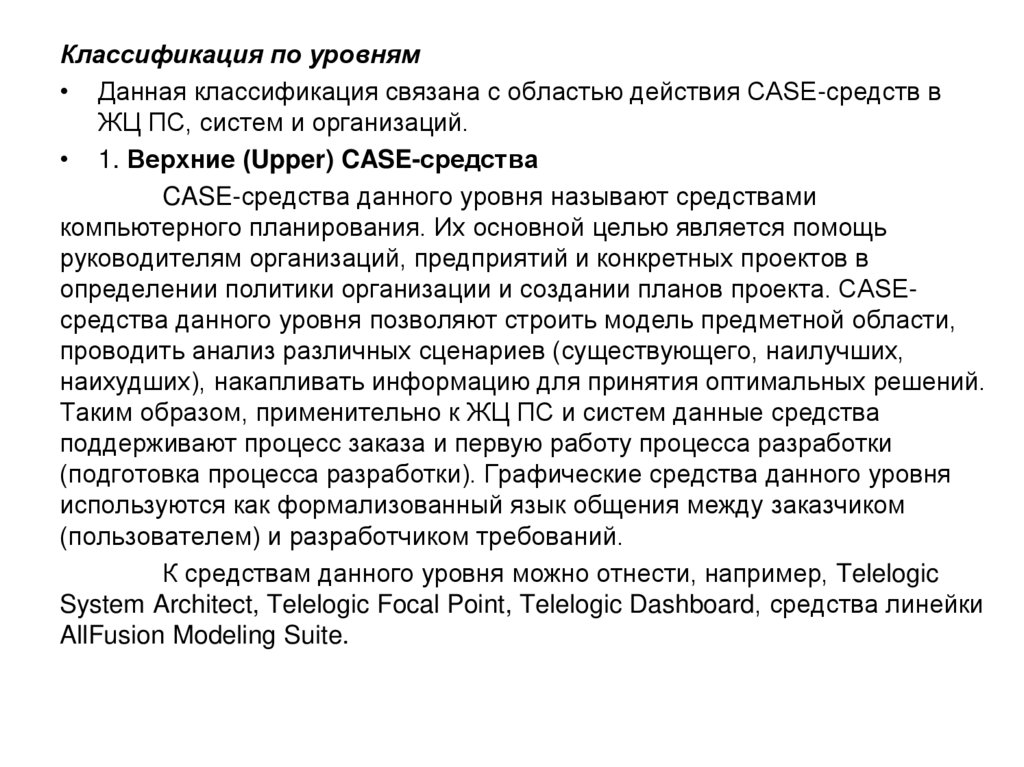 • Классификация по уровням связана с областью действия CASEсредств в ЖЦ ПС и систем. Различают верхние, средние и нижние