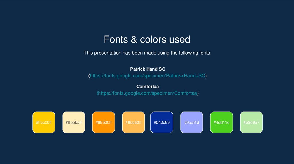 Fonts & colors usedThis presentation has been made using the following fonts:
