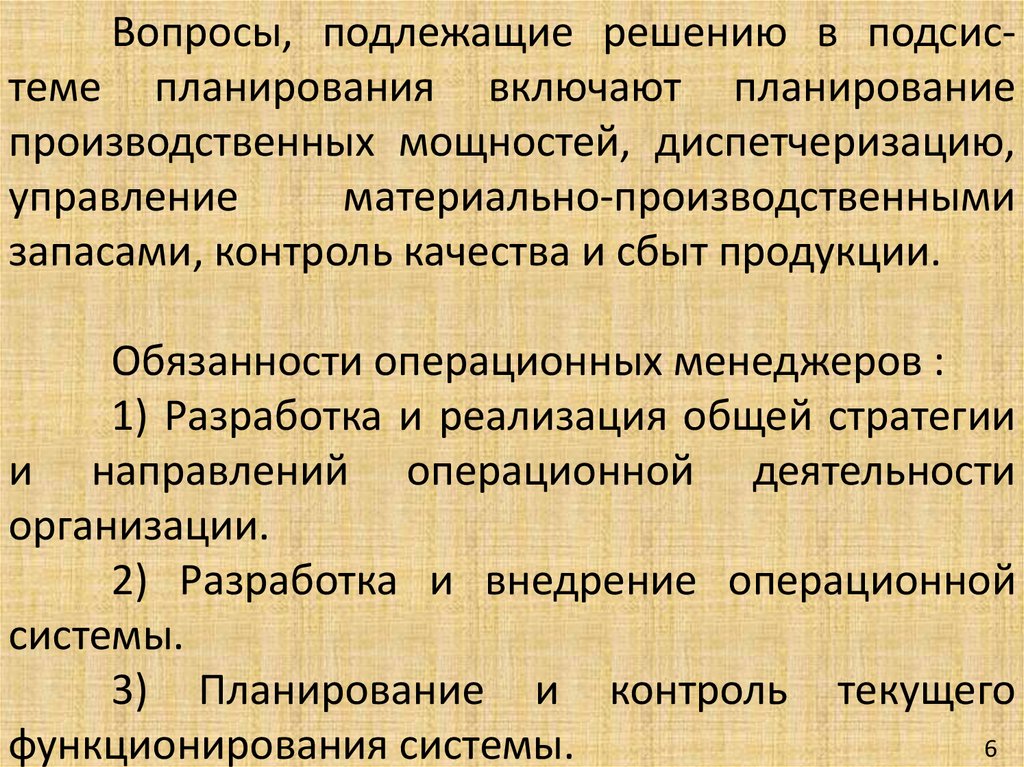 Вопросы, подлежащие решению в подсистеме планирования включают планированиепроизводственных мощностей, диспетчеризацию,