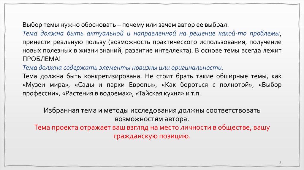 Выбор темы нужно обосновать – почему или зачем автор ее выбрал.Тема должна быть актуальной и направленной на решение какой-то проблемы,