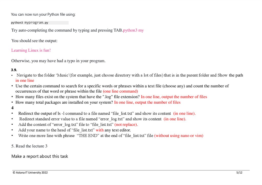 • Write one more line with phrase “THE END” at the end of “file_list.txt” file (without using nano or vim)