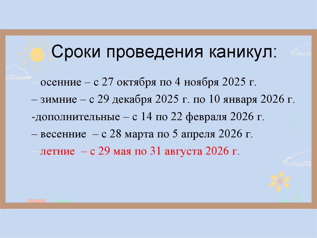 Сроки проведения каникул:– осенние – с 27 октября по 4 ноября 2025 г.