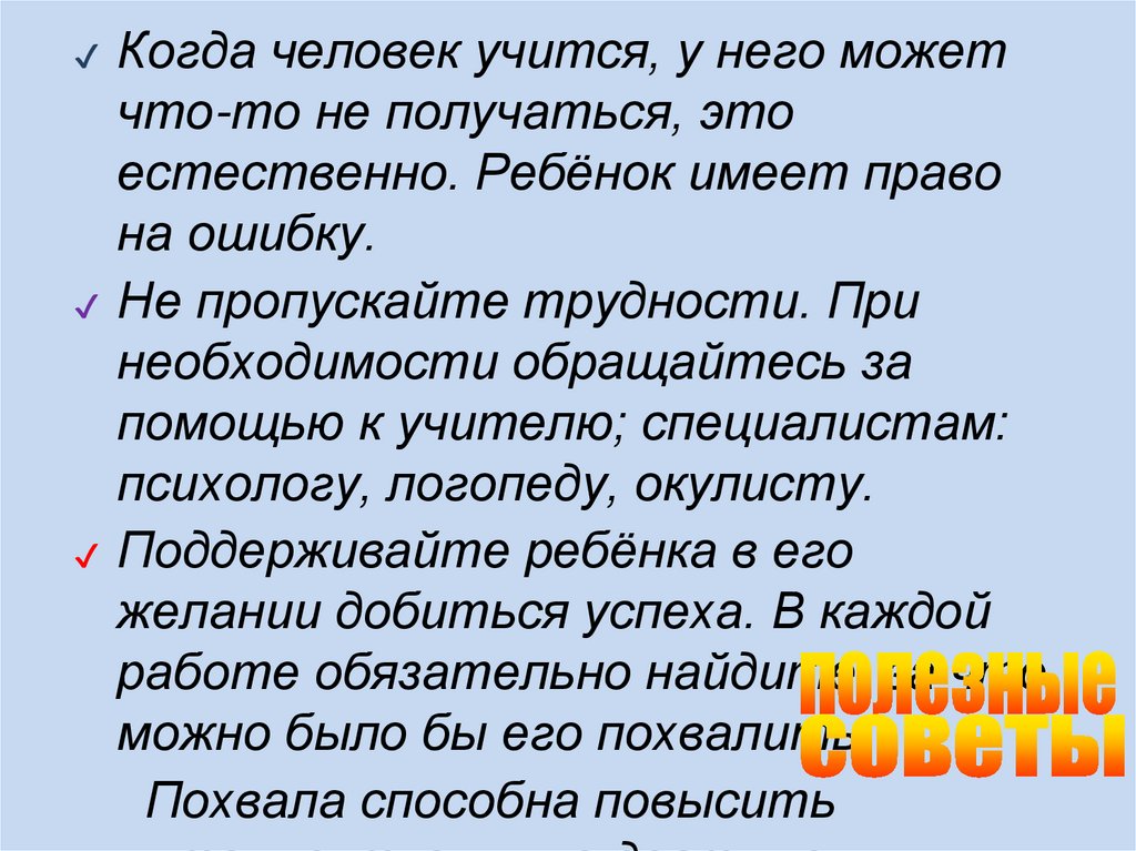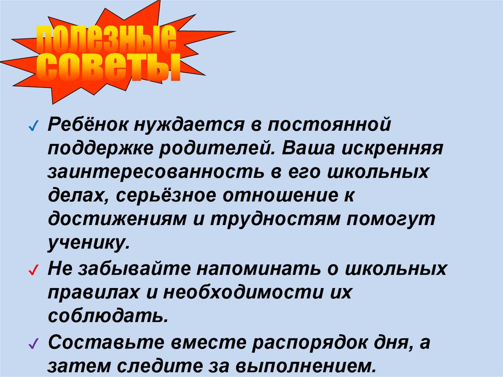 ✔ Ребёнок нуждается в постояннойподдержке родителей. Ваша искренняя
