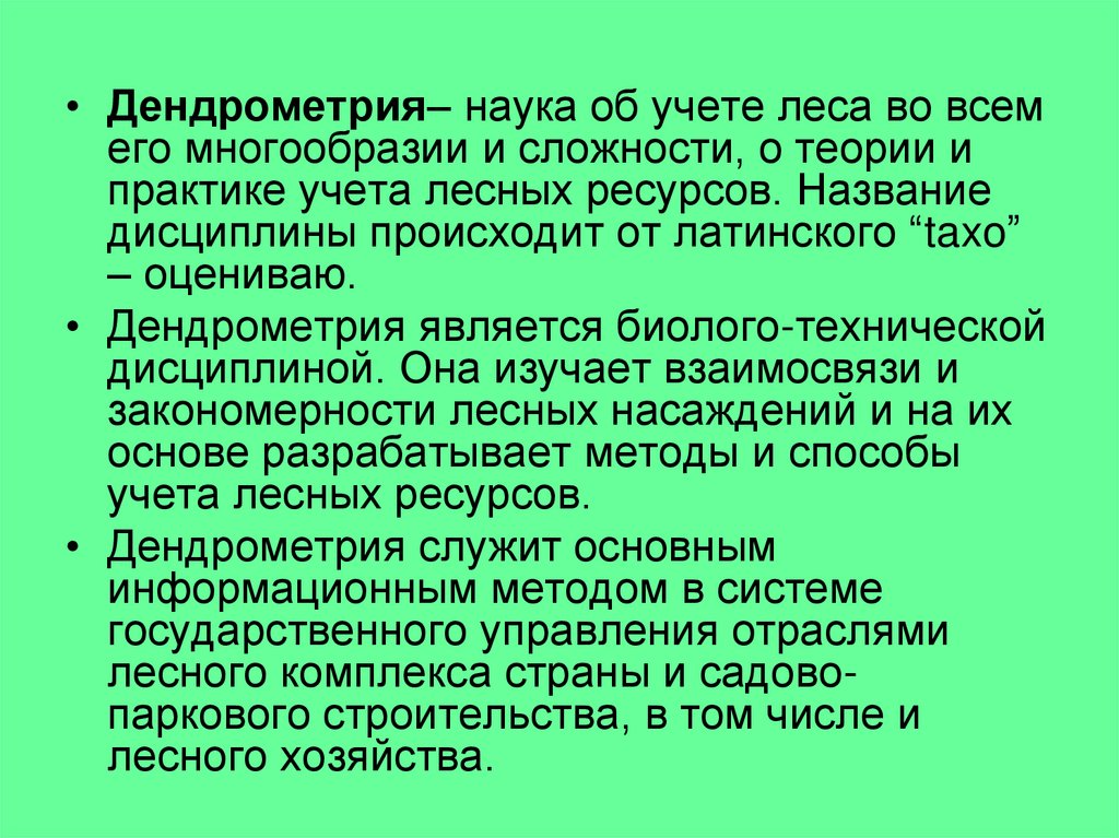 • Дендрометрия– наука об учете леса во всемего многообразии и сложности, о теории и
