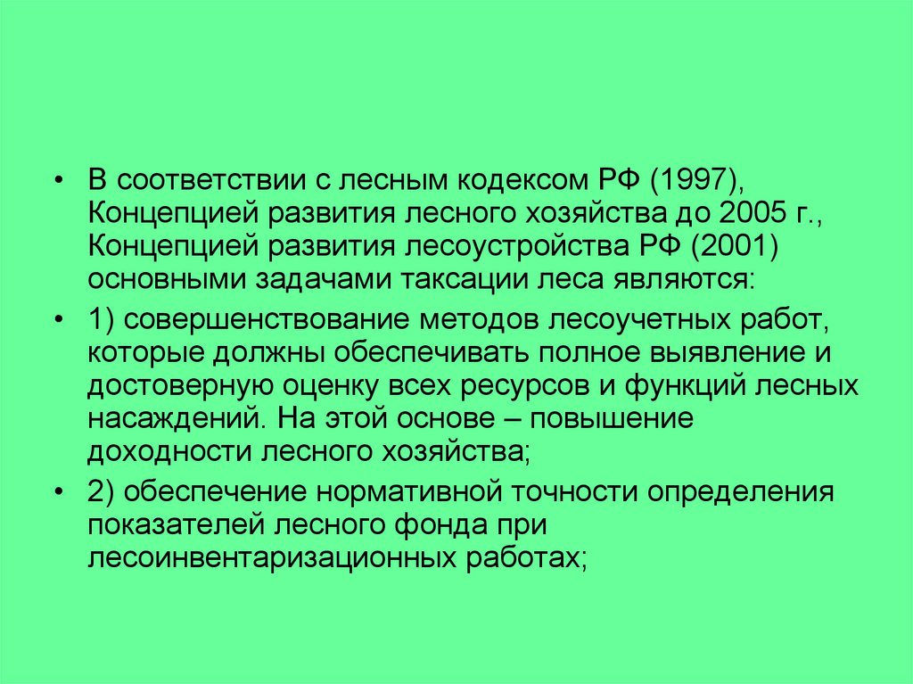 • В соответствии с лесным кодексом РФ (1997),Концепцией развития лесного хозяйства до 2005 г.,